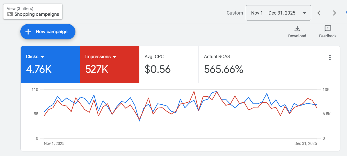 Dec 30, 2024 – Apr 21, 2025: 4.76K clicks, 527K Impressions, $0.56 CPC, ROAS 565.66% (~5.66x)Electric scooters e-commerce: