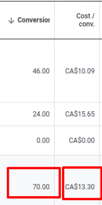 Month 3: 70 conversions @ CA$13.30 cost/conv